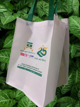 Ini salah contoh pesanan tas dari multazam tour tas bahan spunbond warna putih sablon 1 muka banyak warna.