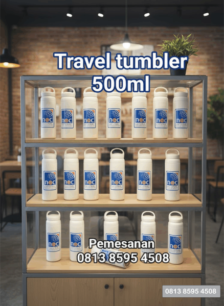 berikut contoh pesanan tumbler travel dengan logo NEC, minat model ini bisa cetak logo sesuai pemintaan